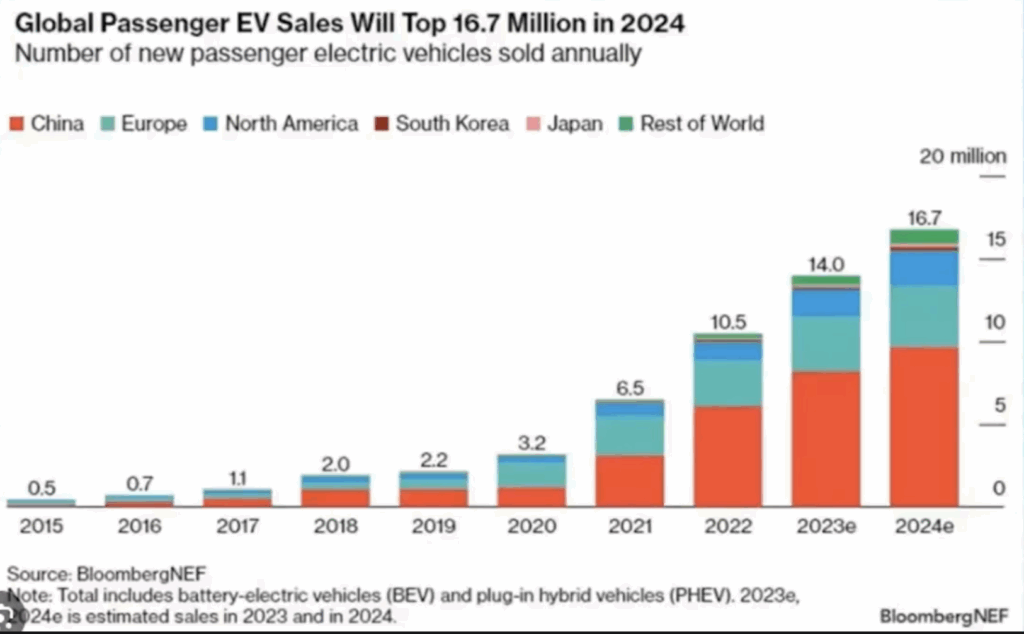 Hoy el auto más fabricado del mundo es un Tesla Model Y, superando al Toyota Corolla que lideró el mercado durante mucho tiempo. El crecimiento de la movilidad eléctrica es exponencial. Lidera China, y luego lo siguen Europa y Norteamérica.