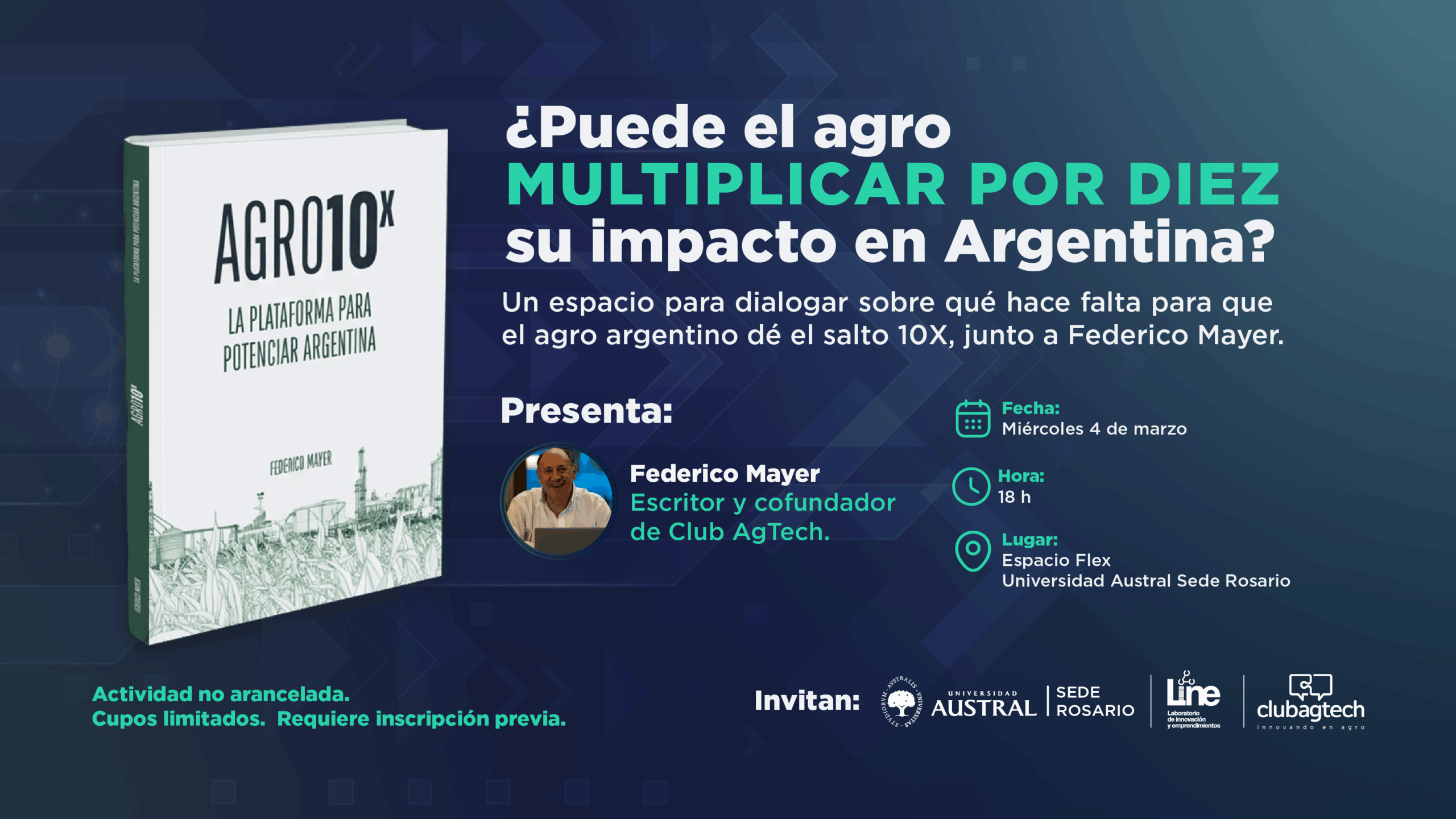 En el marco de El Futuro del Futuro, el Laboratorio de Innovación y Emprendimientos de la Universidad Austral Sede Rosario invita a participar de la presentación del libro “Agro 10X. La plataforma para potenciar Argentina”, que se realizará el miércoles 4 de marzo a las 18 h en el Espacio Flex de la Universidad (Paraguay 1978).