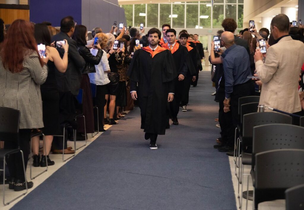 El hall central de la Universidad Austral se llenó de familias, amigos, profesores y colaboradores que acompañaron a los graduados a lo largo de sus años de estudio. El color naranja que caracteriza a la Facultad de Ingeniería tiñó ambas ceremonias de celebración y alegría. Encabezaron los actos el rector de la Universidad Austral, Mag. Julián Rodríguez Priore, y el decano de la Facultad de Ingeniería, Ing. Emilio López-Gabeiras.