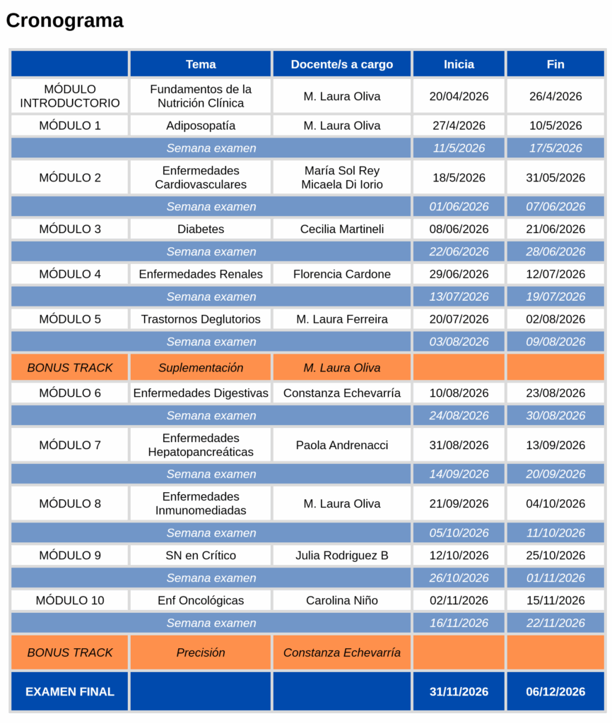 El programa estará dictado por un equipo multidisciplinario de expertos nacionales e internacionales con experiencia clínica, académica e investigativa en las áreas de nutrición y salud. Cada módulo contará con docentes destacados en su especialidad, garantizando una formación de excelencia.