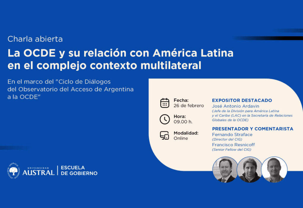 Este miércoles 26 de febrero, el Centro de Estrategias Internacionales de Gobiernos y Organizaciones (CIG) dio inicio al «Ciclo de Diálogos del Observatorio del Acceso de Argentina a la OCDE» con una primera sesión dedicada a la relación de la OCDE con América Latina en el actual contexto de crisis del multilateralismo.