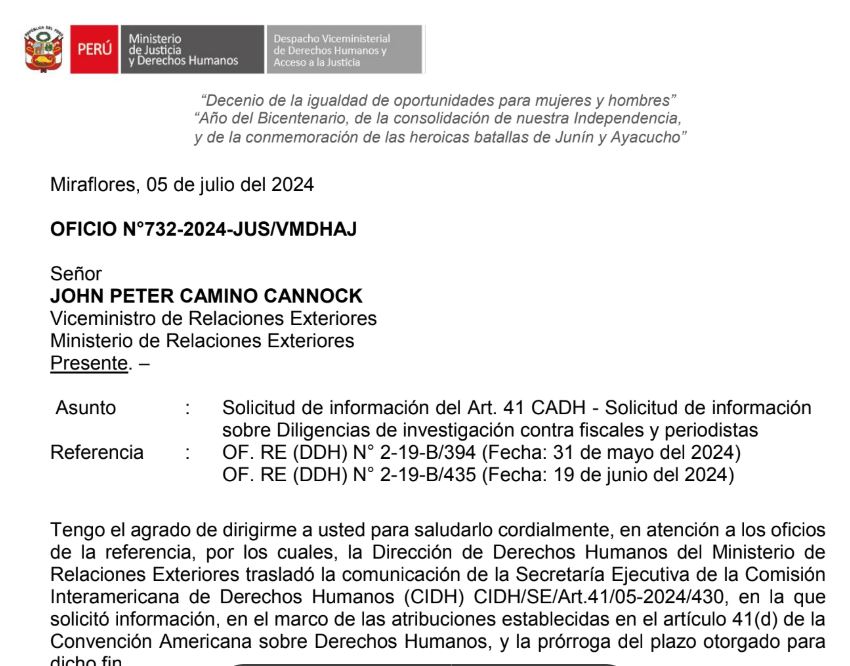 A continuación, se incluirá el listado de las comunicaciones enviadas por la CIDH al Estado peruano durante 2024 que se logró obtener (títulos, fechas, referencias). Es importante remarcar que, aun habiendo conseguido las respuestas mencionadas, no se obtuvieron todas las solicitadas como es el caso de la investigación de periodistas, lo que podría habilitar a acciones judiciales de acceso a la información pública.