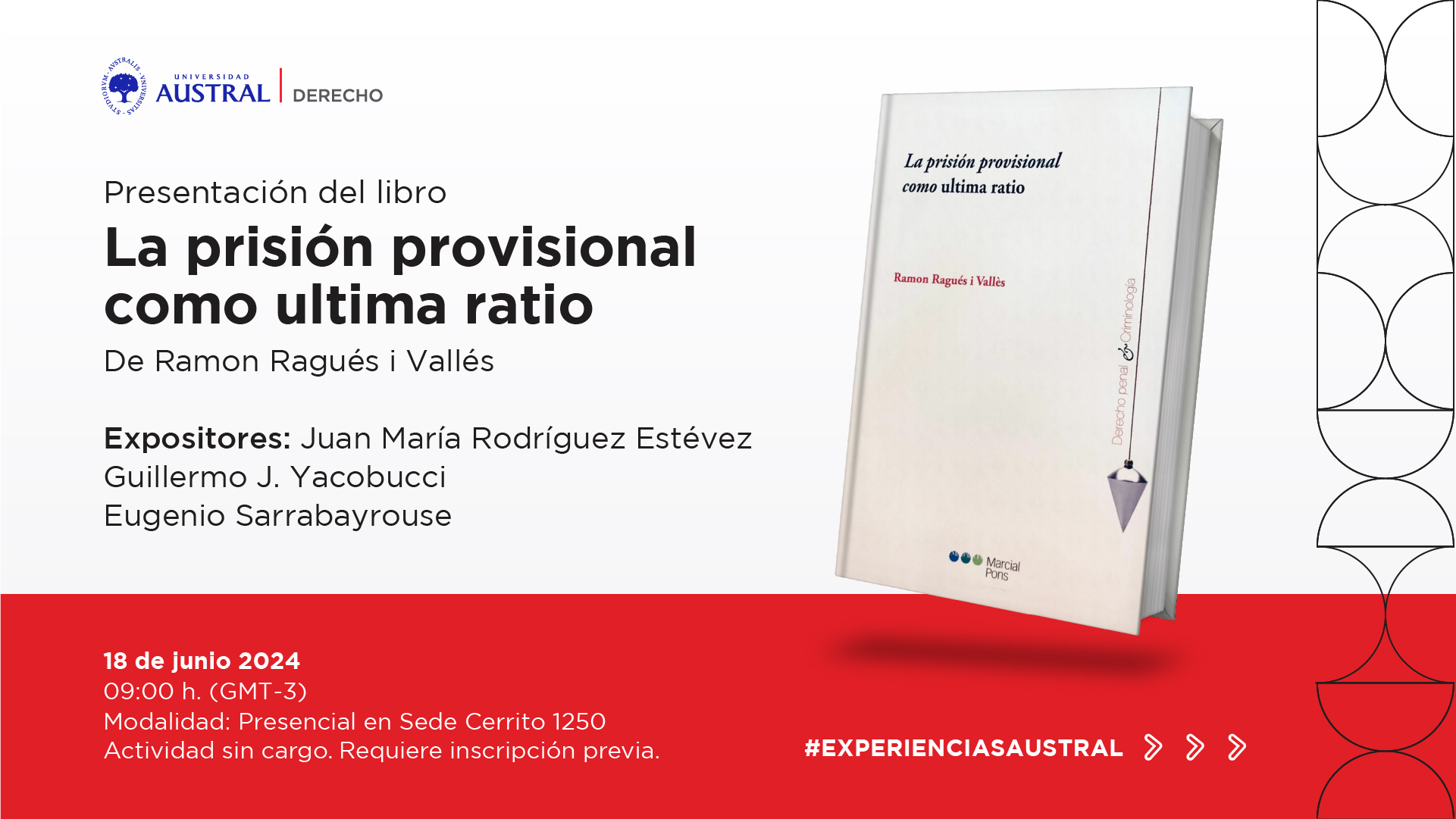 La Facultad de Derecho de la Universidad Austral, invita a participar de la presentación del libro “La prisión provisional como ultima ratio” cuyo autor es el Dr. Ramon Ragués i Vallés.