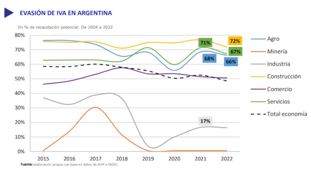 Por segundo año consecutivo, el Centro de Estudios Tributarios de la Universidad Austral (CET) presentó un informe en el que analiza la problemática de la informalidad de la economía y su vínculo con la evasión impositiva. Los últimos datos que se dieron a conocer fueron los de 2022 y marca que la evasión de IVA en Argentina presentó el valor más bajo de la serie con un 49%, luego del 52% mostrado en 2021. El informe destaca la disminución de la evasión respecto al 52% registrado en 2021, aunque ambos valores siguen reflejando un nivel elevado en términos históricos.