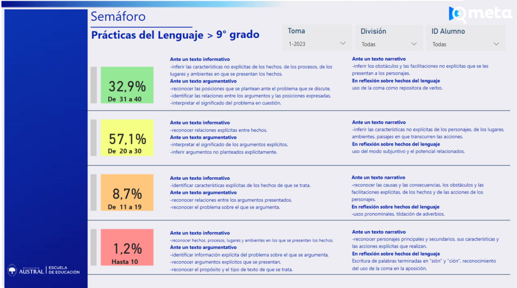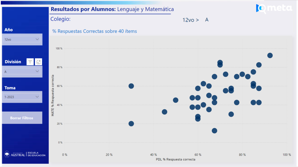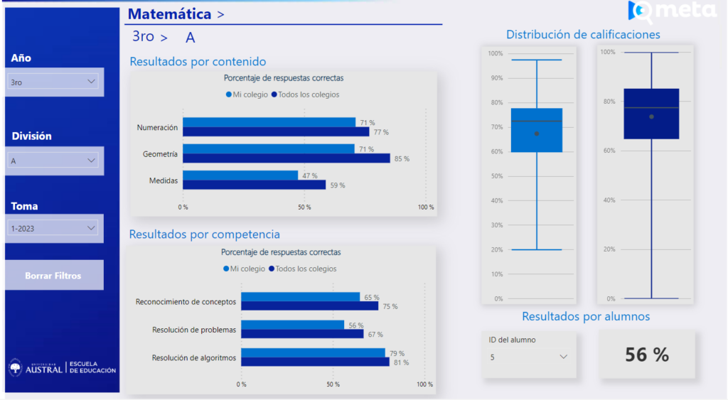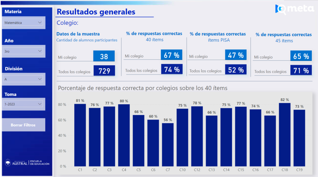 Además, los informes cuantitativos que genera META permiten hacer un seguimiento longitudinal del desempeño y comparar los resultados propios con los del conjunto de escuelas participantes.