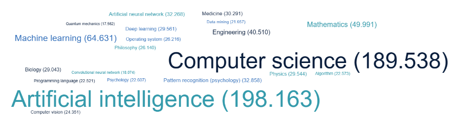 Fig. 2 highlights the distribution of research publications across key fields within the realm of Artificial Intelligence (AI), AI boasting a substantial 198,163 publications, indicating the significant role it plays. Computer science follows closely behind, with 189,538 publications, emphasizing the close relationship between AI and computer science disciplines. This highlights the significant overlap and mutual influence between the two fields, as AI innovations often drive advancements in computer science and vice versa. Machine learning and Deep learning are also prominent areas of study, with 64,631 and 29,561 publications, respectively. Other notable fields include «Artificial neural network,» «Computer vision,» «Data mining,» and «Pattern recognition (psychology),» each contributing significantly to the breadth and depth of AI research. Furthermore, the inclusion of fields such as «Biology,» «Engineering,» «Medicine,» «Philosophy,» and «Physics», among others, underscores the interdisciplinary nature of AI research. This interdisciplinary approach reflects the multifaceted challenges and opportunities presented by AI, as researchers draw upon insights and methodologies from various domains to address complex problems and drive innovation.