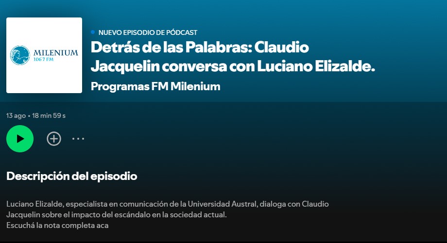 Entrevista al profesor de la facultad de Comunicación, Luciano Elizalde, en FM Millenium con el periodista Claudio Jacquelin, sobre el impacto del escándalo en la sociedad actual.
