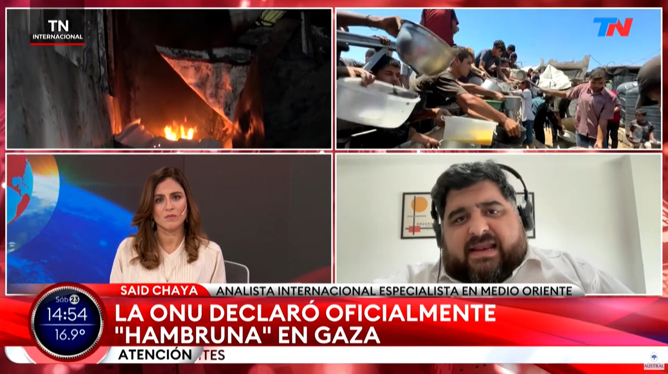 Entrevista al coordinador del Núcleo de Estudios de Medio Oriente de la Escuela de Política, Gobierno y Relaciones Internacionales de la Universidad Austral, Said Chaya, en el programa TN Internacional, de la señal Todo Noticias (TN), sobre la situación humanitaria en Gaza y la declaración de la ONU de "hambruna" en esa región.