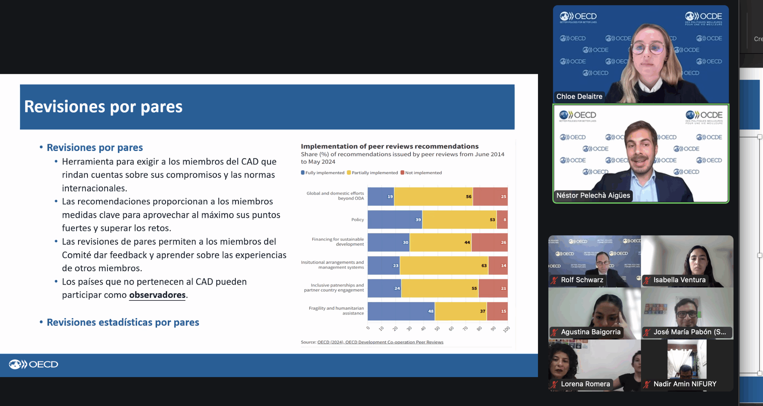 Participaron como expositores Rolf Schwarz, Head of Global Engagement Unit de la Dirección de Cooperación para el Desarrollo (DCD) de la OCDE; Chloé Delaitre Bonet, Junior Policy Analyst, Global Engagement (DCD); y Néstor Pelechá Aigues, Policy Analyst, Reforms and Partnerships for Development Impact (DCD).