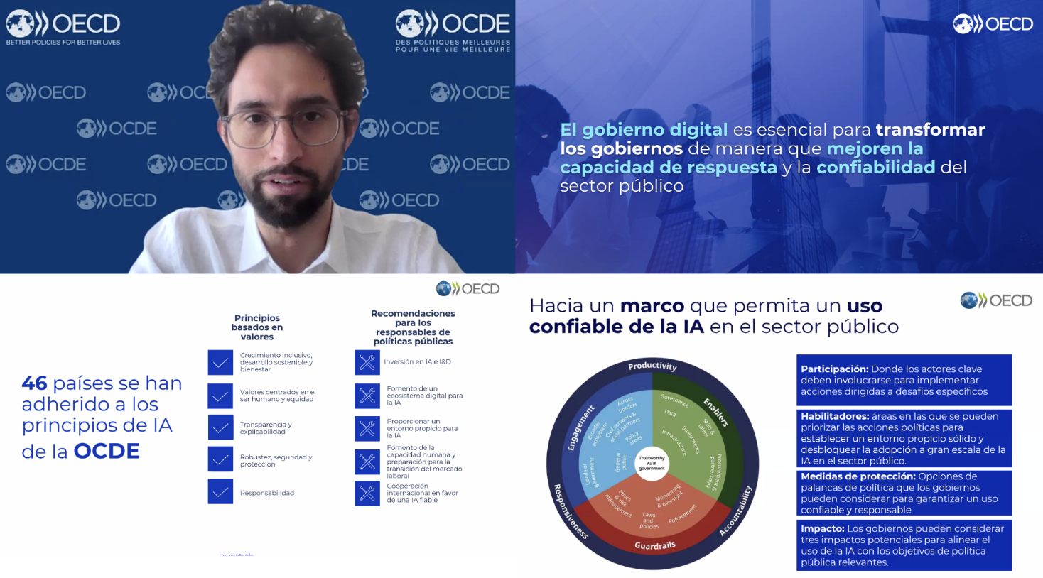 El eje central del encuentro estuvo a cargo de Ricardo Zapata, analista de políticas públicas en la Unidad de Datos y Gobierno Digital de la OCDE, quien presentó los últimos lineamientos del organismo sobre cómo los gobiernos pueden utilizar la inteligencia artificial para diseñar políticas más efectivas, tomar decisiones más precisas y mejorar la calidad de los servicios públicos.
