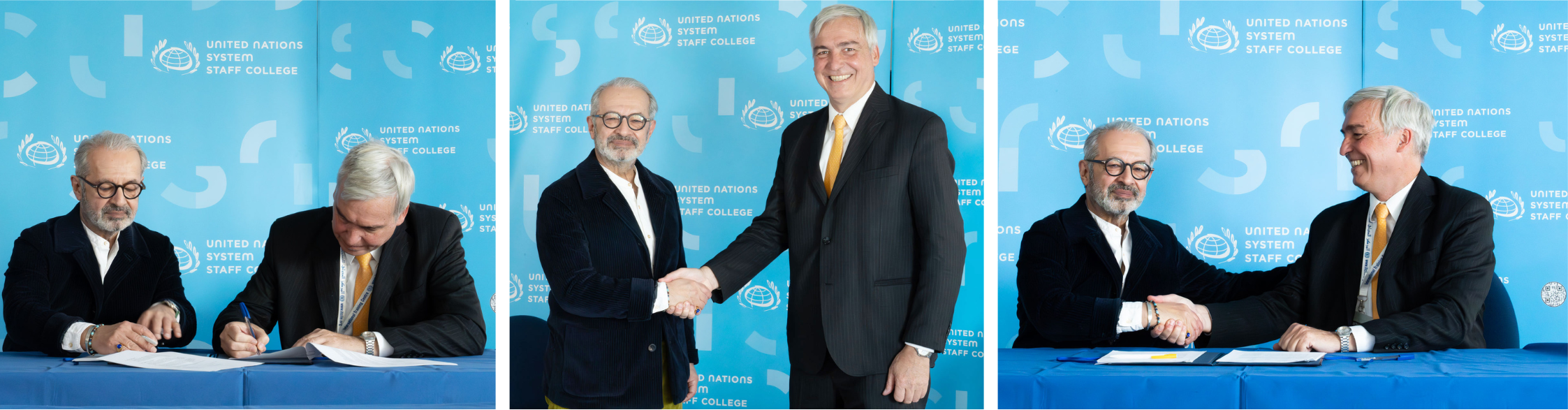 La firma del convenio se llevó a cabo en el campus que el organismo posee en la ciudad de Turín, Italia, y contó con la presencia de Jafar Javan, director de la United Nations System Staff College (UNSSC), y de Alfonso Santiago, director de la Escuela de Política, Gobierno y Relaciones Internacionales de la Universidad Austral. Rubricado el pasado 30 de enero, este acuerdo permitirá realizar actividades de formación conjunta entre ambas instituciones destinadas a los funcionarios de Naciones Unidas, así como a profesionales y líderes sociales. La UNSSC ha seleccionado un reducido número de Escuelas de Gobierno de distintas regiones del mundo con las que pretende realizar actividades de cooperación conjuntas.