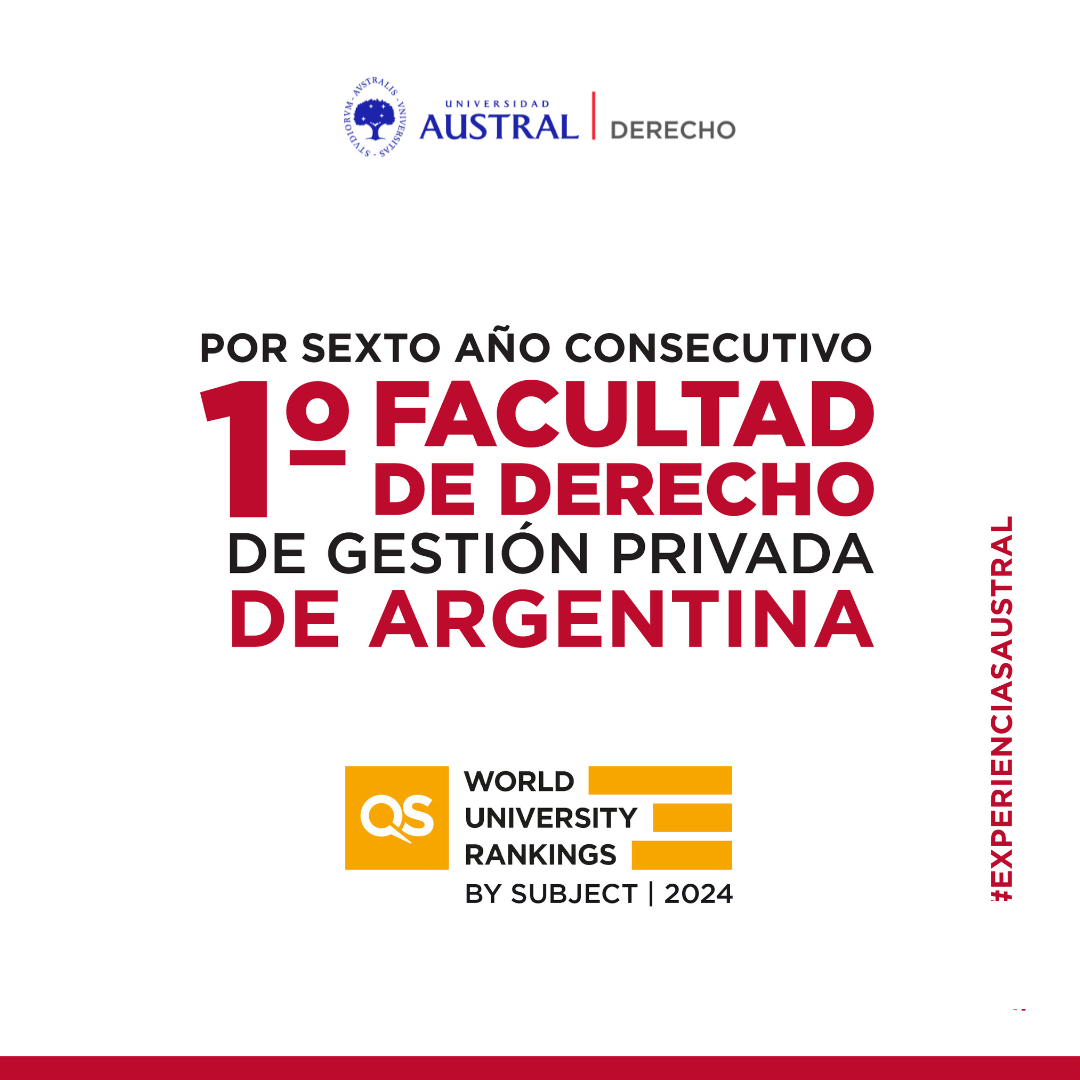 Ciudad de Buenos Aires, 10 de abril de 2024 – La nueva edición del QS World University Rankings by Subject ubica a la Facultad de Derecho de la Universidad Austral como la mejor institución de educación superior de gestión privada del país en el área “Law – Legal Studies”, ubicándose sólamente por detrás de la Universidad de Buenos Aires (UBA). Este nuevo logro confirma el liderazgo que posee históricamente la Universidad Austral en este ranking sobre Derecho, en el cual ha estado ascendiendo posiciones. En el Ranking 2024 se ubica entre las 101-150 mejores facultades de Derecho del mundo, mientras que los años anteriores se ubicó de la siguiente manera: 151-200 (2023 y 2022), 201-250 (2021) y 251-300 (2020). Además, sigue destacándose sostenidamente en los indicadores de “Reputación académica” y de “Empleadores”.