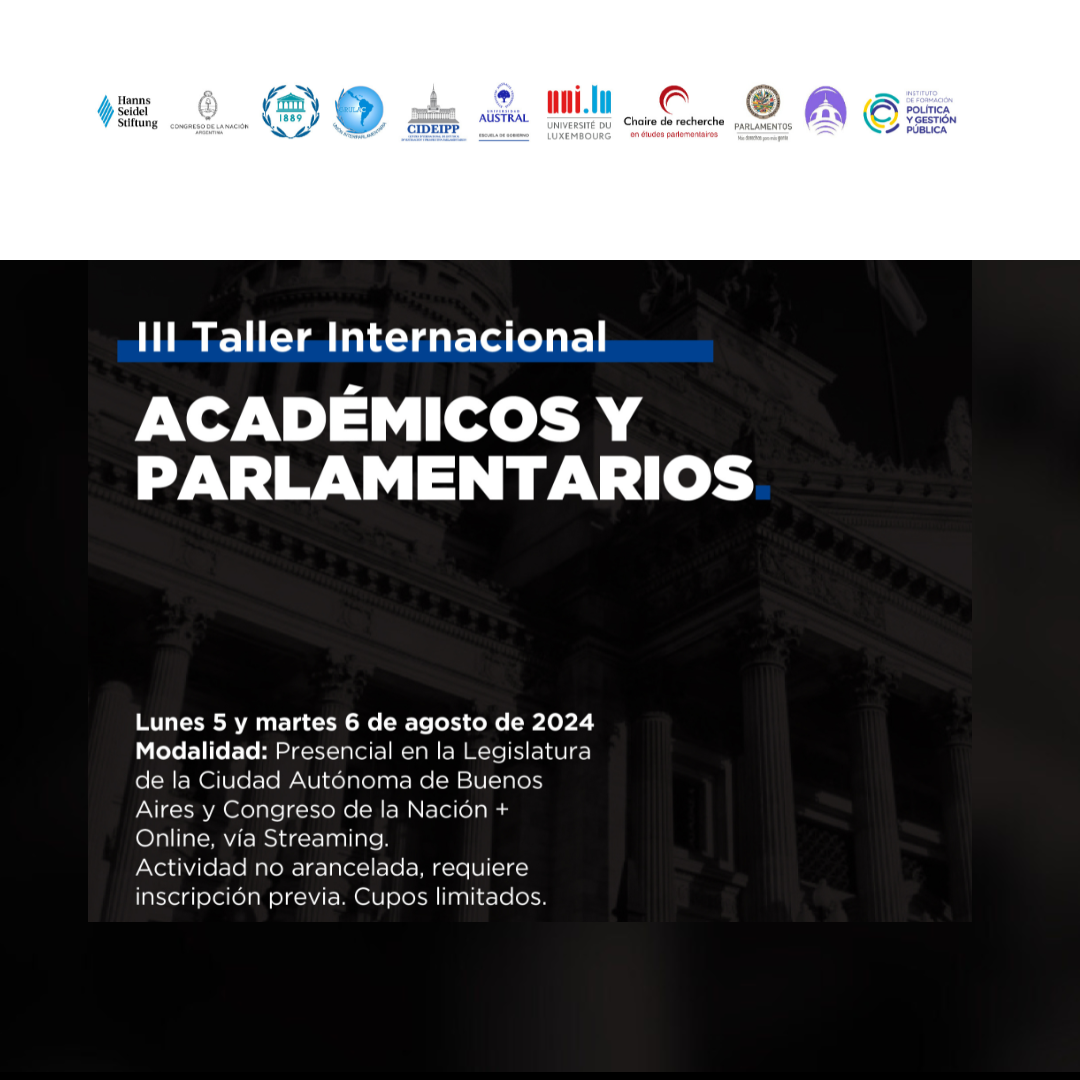 Ciudad de Buenos Aires, 26 de julio de 2024 – El Centro Internacional de Estudios, Investigación y Prospectiva Parlamentarios (CIDEIPP) de la Escuela de Gobierno de la Universidad Austral, en conjunto con la Cátedra de Investigación en Estudios Parlamentarios de la Universidad de Luxemburgo convocan a la tercera edición del Taller Internacional de Académicos y Parlamentarios, bajo el lema “Democracia y parlamentos; pasado, presente y futuro”. El evento es gratuito pero con inscripción previa.