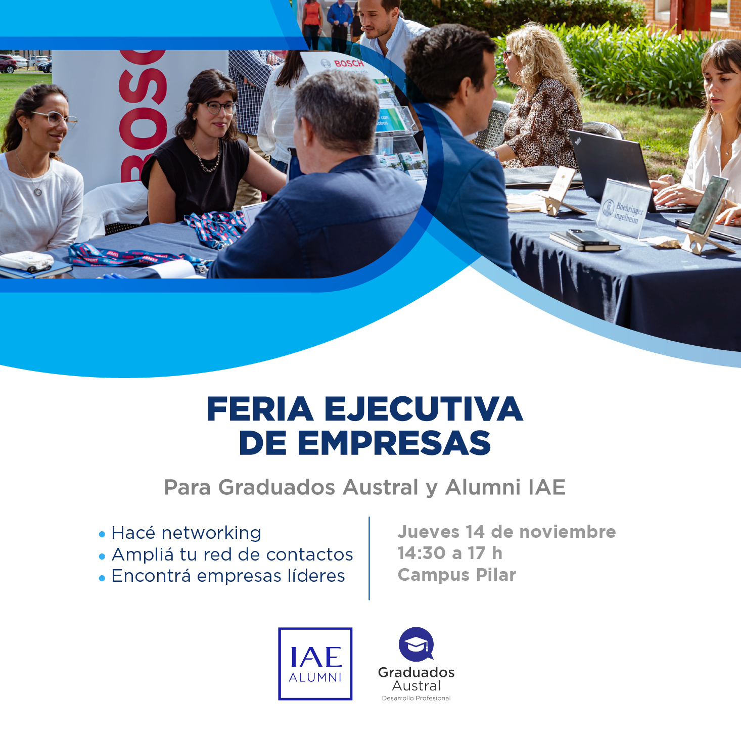 Feria Ejecutiva de Empresas Austral + IAE destinada a Graduados de la Universidad Austral y Alumni IAE con perfiles senior.