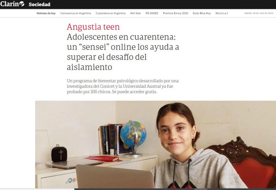 El domingo 26 de Julio de 2020, el diario Clarín publicó una noticia titulada Adolescentes en cuarentena: un “sensei” online los ayuda a superar el desafío del aislamiento. La nota, publicada en uno de los diarios de mayor audiencia del país, recogió una entrevista realizada a la Dra. Belén Mesurado, investigadora principal del proyecto, junto con testimonios de adolescentes que participaron del programa y de sus padres.
