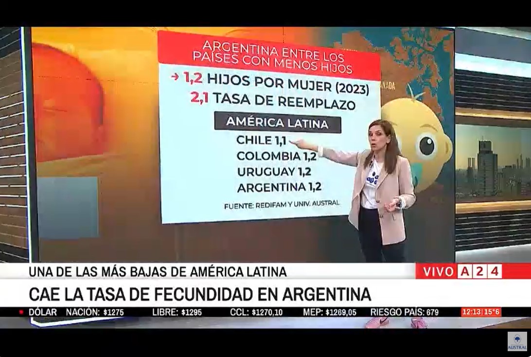 En el programa "Buen día" del canal A24 se presentaron datos de un informe del Instituto de Ciencias para la Familia de la Universidad Austral sobre el cambio demográfico en Argentina. La tasa de fecundidad cayó de 2.1 hijos por mujer a 1.2 en 2023, mientras que los nacimientos disminuyeron un 40% en los últimos nueve años.