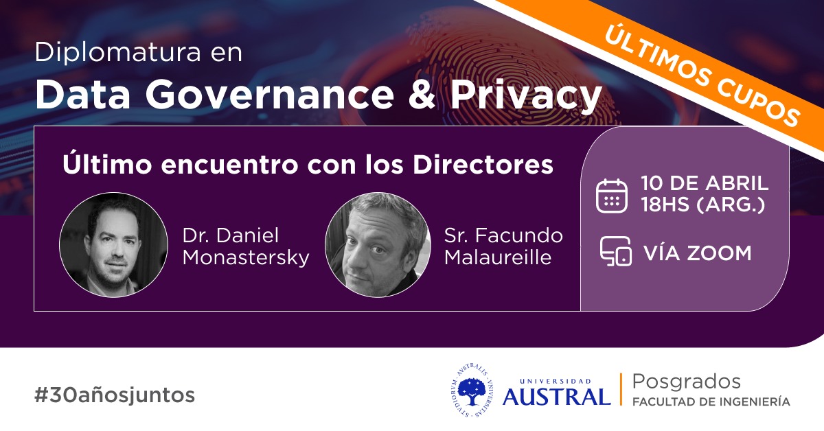 La Diplomatura en Data Governance & Privacy comienza este martes 15 de abril. Si todavía no pudiste sumarte a una reunión informativa o tenés dudas que te gustaría conversar de manera más cercana, queremos invitarte a un último encuentro exclusivo con el director del programa.