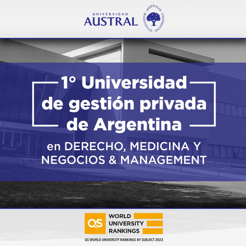 La edición 2023 del QS World University Rankings by Subject ubica a la Universidad Austral como la Universidad de gestión privada número 1 del país en la enseñanza de Derecho y Medicina, a través de la Facultad de Derecho y la Facultad de Ciencias Biomédicas, respectivamente.