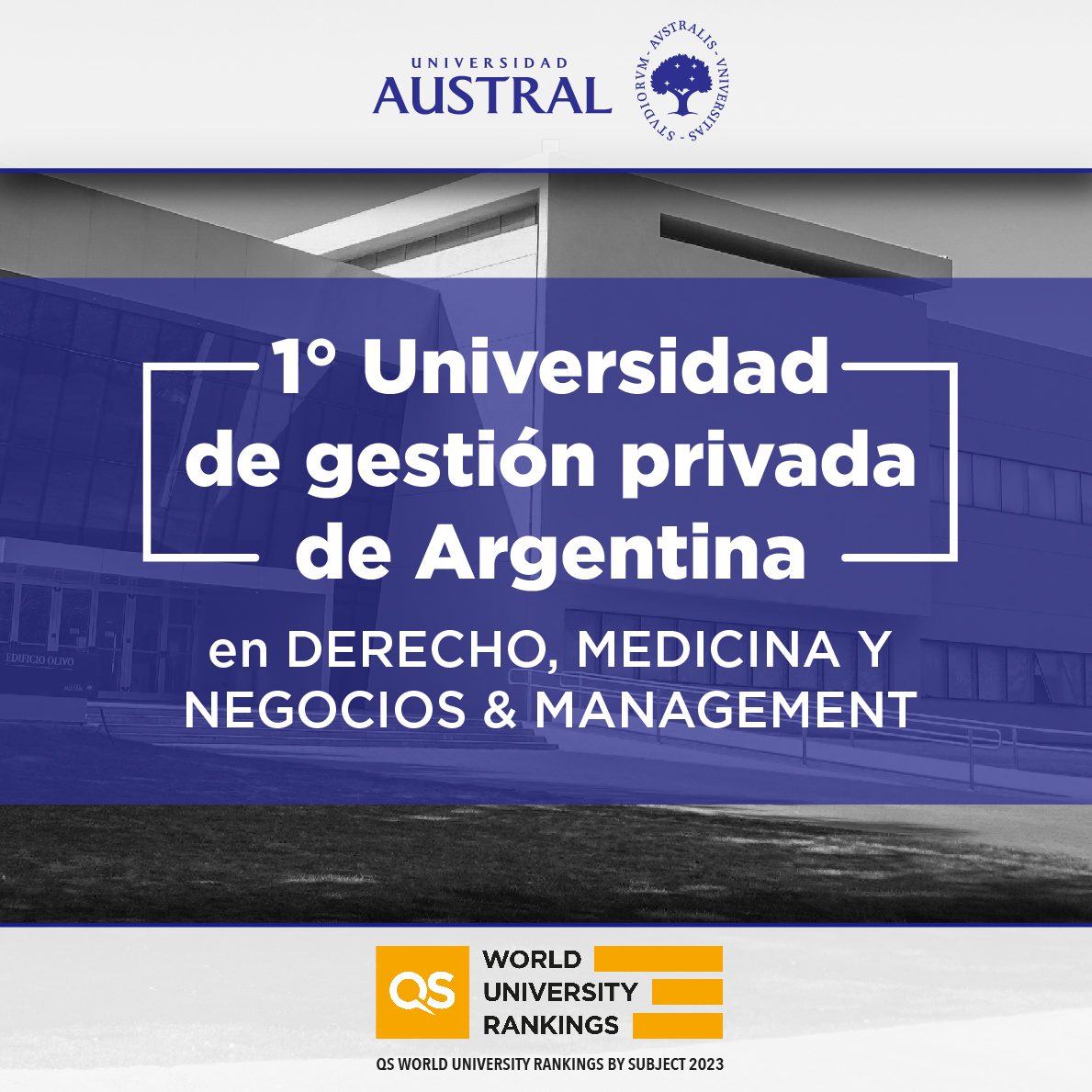 Con gran alegría queremos contarles que por quinto año consecutivo, la Universidad Austral se ubica como la primera Universidad de gestión privada en la Argentina en las disciplinas Medicina (Medicine) y Derecho (Law & Legal Studies) del QS World University Rankings by Subject 2023. Además, vuelve a ubicarse primera dentro del ámbito educativo privado en la disciplina de Negocios & Management (Business & Management Studies), consolidando su reputación de excelencia educativa.