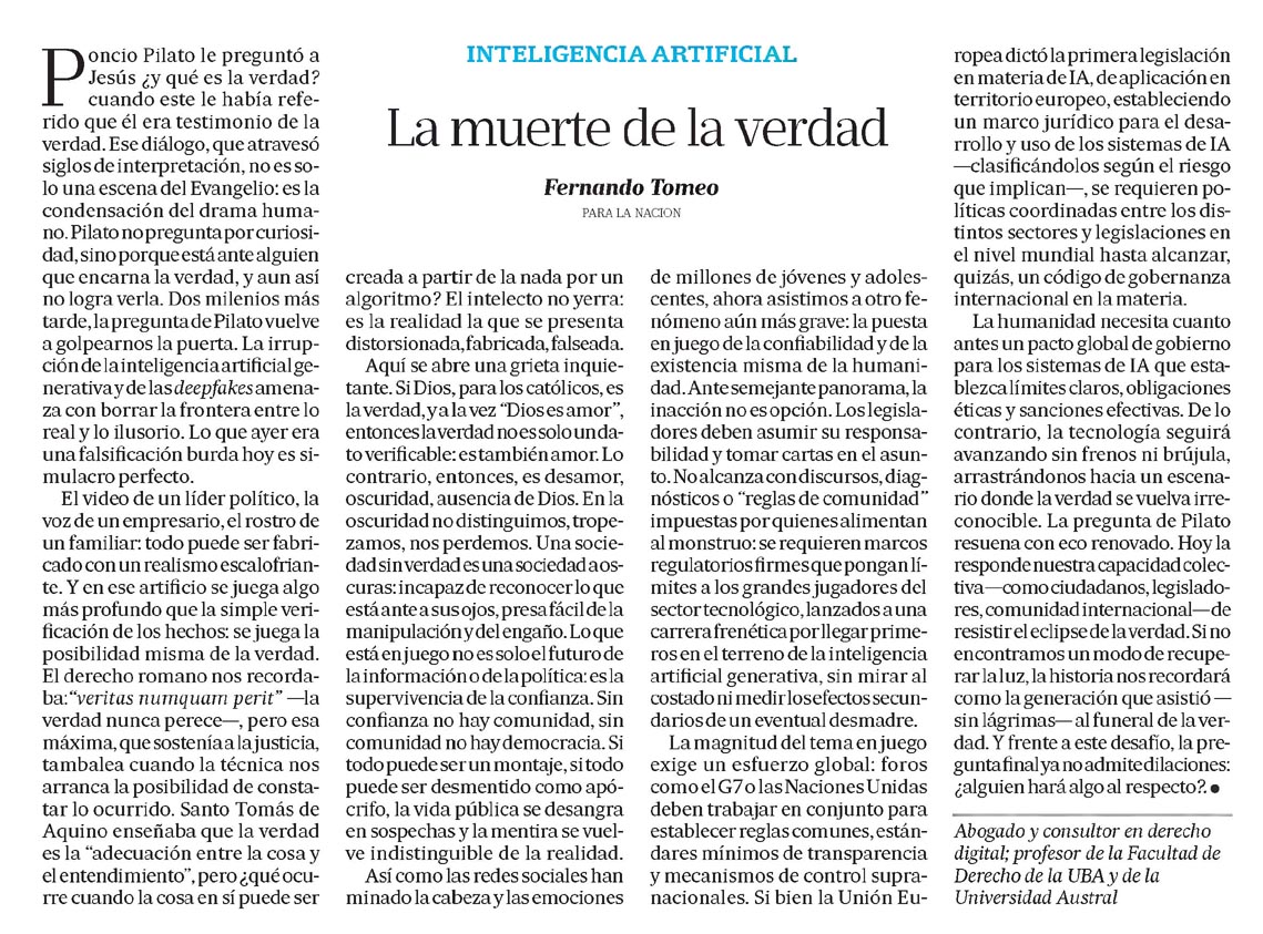 Poncio Pilato le preguntó a Jesús ¿y qué es la verdadcuando éste le había referido que él era testimonio de la verdad. Ese diálogo, que atravesó siglos de interpretación, no es solo una escena del Evangelio: es la condensación del drama humano. Pilato no pregunta por curiosidad, sino porque está ante alguien que encarna la verdad, y aun así no logra verla. Dos milenios más tarde, la pregunta de Pilato vuelve a golpearnos la puerta. La irrupción de la inteligencia artificial generativa y de las deepfakes amenaza con borrar la frontera entre lo real y lo ilusorio. Lo que ayer era una falsificación burda, hoy es simulacro perfecto.