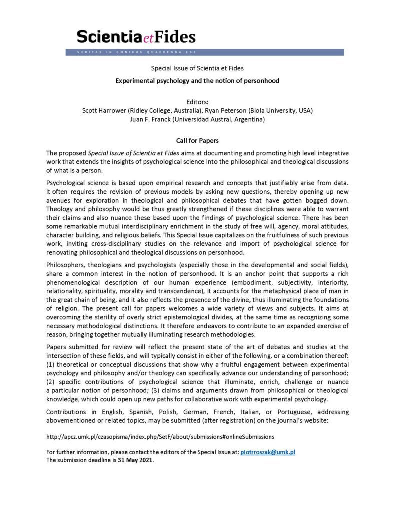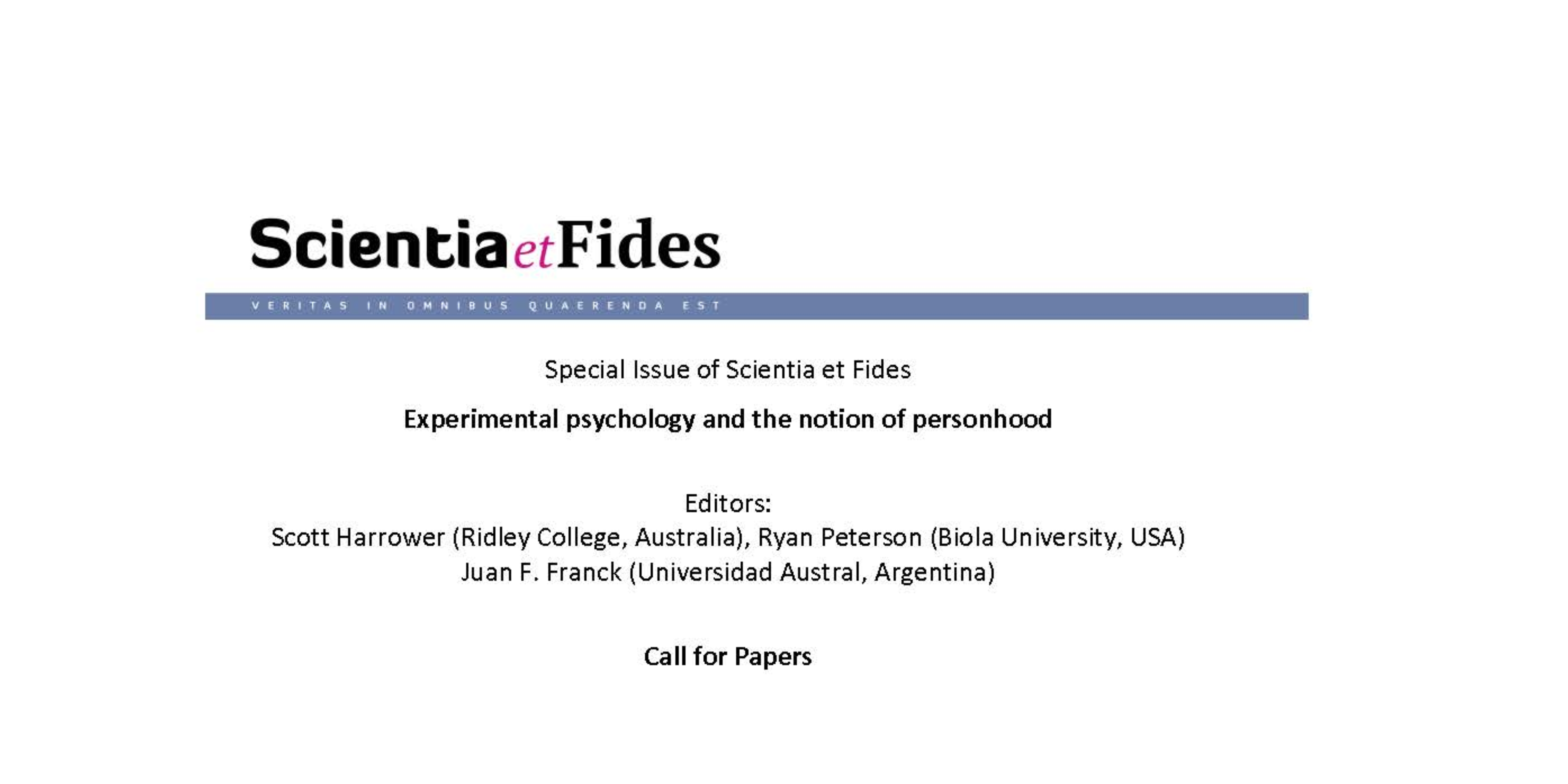 Compartimos la convocatoria de artículos de la revista Scientia et Fides para el número especial «La psicología experimental y la noción de persona», editado por Juan F. Franck (U. Austral), Scott Harrower (Ridley College, Melbourne, Australia) y Ryan Peterson (Biola University, Los Angeles, CA).
