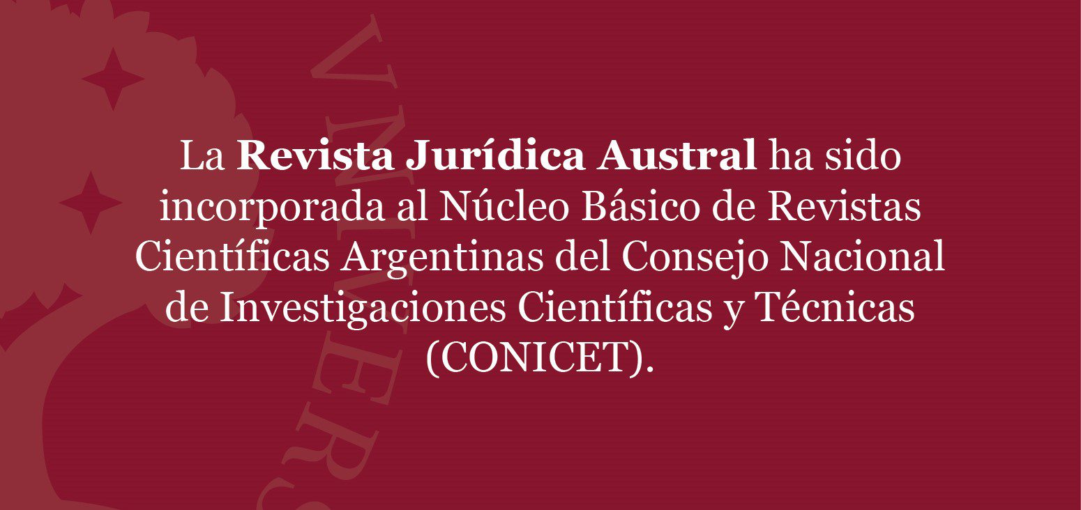 La Revista Jurídica Austral (RJA) se complace en anunciar con gran satisfacción y alegría su incorporación, mediante una resolución, al Núcleo Básico de Revistas Científicas Argentinas del Consejo Nacional de Investigaciones Científicas y Técnicas (CONICET).