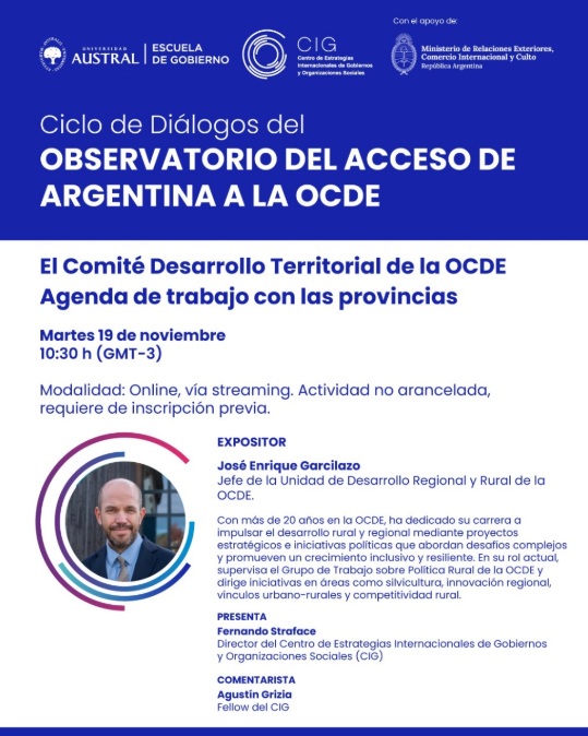 El Observatorio del Acceso de Argentina a la OCDE, recientemente creado en el Centro de Estrategias Internacionales de Gobiernos y Organizaciones Sociales (CIG) de la Universidad Austral, dio inicio a su «Ciclo de Diálogos» con un evento inaugural sobre la agenda de trabajo de la OCDE para el desarrollo territorial en Argentina.