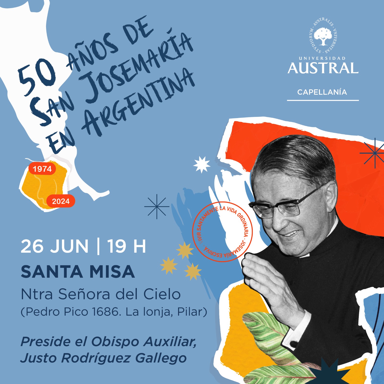 Nos complace invitarlos a participar de la misa en honor a San Josemaría, presidida por Mons. Justo Rodríguez Gallego, obispo auxiliar, el miércoles 26 de junio a las 19H en la Iglesia Nuestra Señora del Cielo, ubicada en Pedro Pico 1686, La Lonja, Pilar.