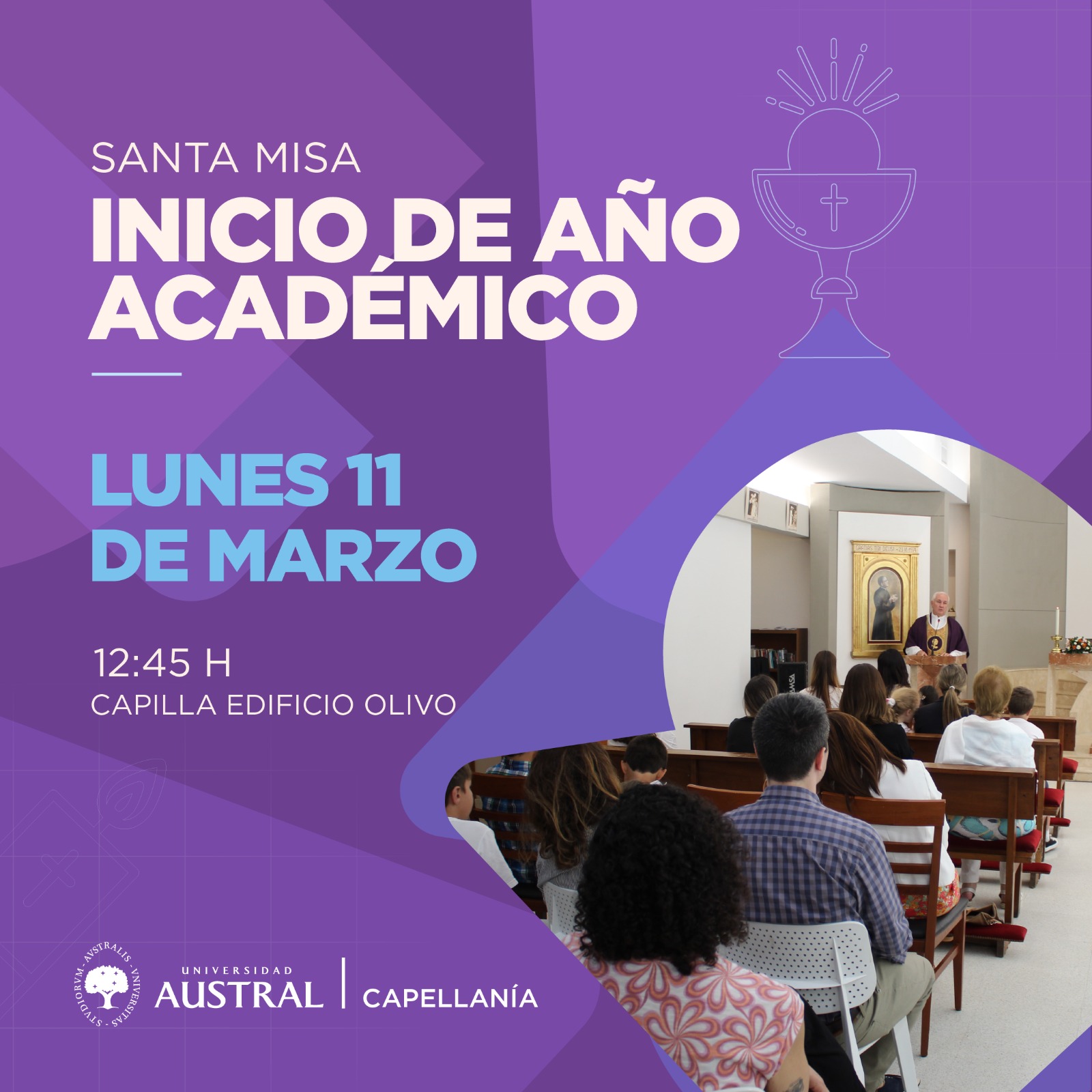 Invitamos muy especialmente a toda la comunidad de alumnos, profesores y colaboradores de todas las facultades y áreas, a participar de la Misa por el Inicio del Año Académico que se realizará el lunes 11 de marzo a las 12.45 horas en la Capilla del Edificio Olivo.