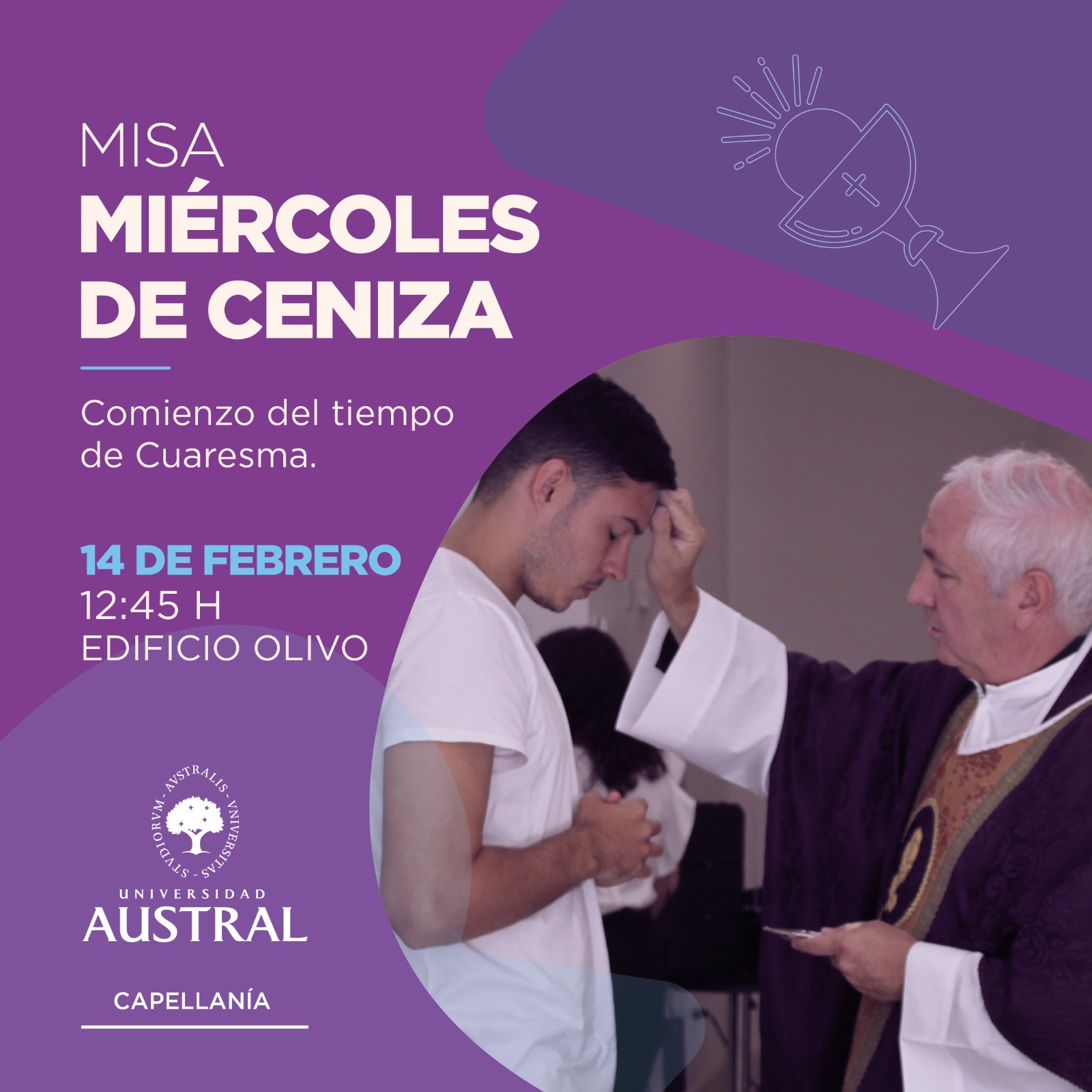 Los invitamos a participar de la Santa Misa con bendición e imposición de cenizas, el miércoles 14 de febrero a las 12.45 H en la Capilla del Edificio Olivo.