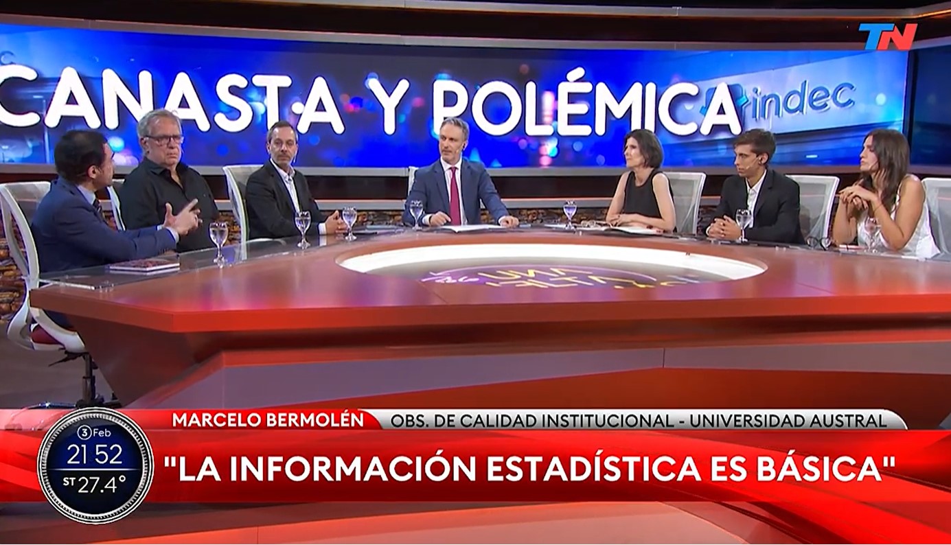 Marcelo Bermolén, director del Observatorio de la Calidad Institucional de nuestra Escuela de Gobierno, reflexionó en el programa "Solo una vuelta más" de la señal de cable Todo Noticias (TN) sobre la decisión del Gobierno de postergar la aplicación del nuevo índice para medir la inflación por parte del INDEC.