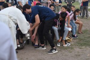 Al mediodía algunos preparaban el almuerzo, que comían en el parque a un costado de la Capilla. A las 14:30, comenzaban nuevamente los trabajos y, además, se realizaban juegos y actividades para los niños. Por otro lado, el grupo de liturgia preparaba todo para la ceremonia del día.