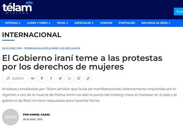Analistas consultados por Télam señalan que la ola de manifestaciones violentamente rerpimidas por el régimen a raíz de la muerte de Mahsa Amini es sólo la punta del iceberg: crece el malestar en el país y el gobierno de Raisi no tiene respuestas para hacerles frente. TELAM SE 2022. Queda expresamente prohibida la utilización de este contenido sin citar la autoría de TELAM, la omisión de este requisito es violatorio del Régimen Legal de la Propiedad Intelectual, Ley 11.723. lo que habilita el reclamo de nuestros derechos por vía judicial.