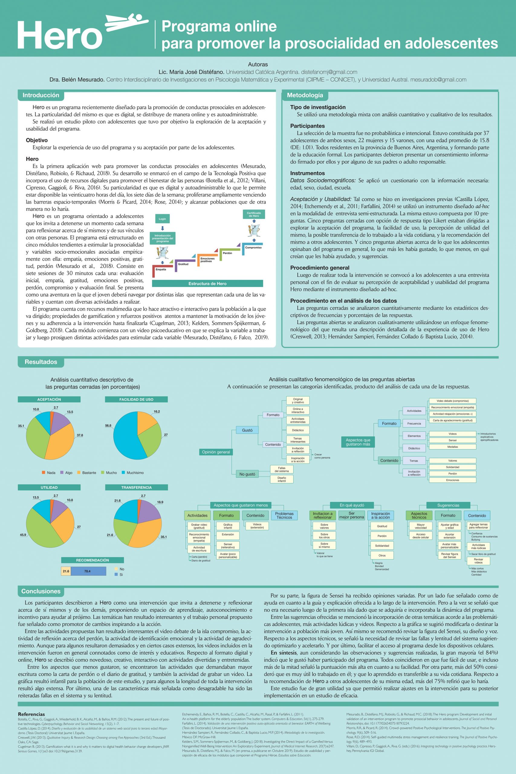 Hero es un programa recientemente diseñado para la promoción de conductas prosociales en adolescentes. La particularidad del mismo es que es digital, se distribuye de manera online y es autoadministrable. Se realizó un estudio piloto con adolescentes que tuvo por objetivo la exploración de la aceptación, facilidad de uso, percepción de utilidad y transferencia de lo aprendido a lo largo de la intervención. La muestra estuvo compuesta por 37 adolescentes de ambos sexos, con edades entre 14 y 17 años. Luego de realizar toda la intervención se los convocó a una entrevista persona con el fin de evaluar su percepción de aceptabilidad y usabilidad del programa Hero mediante un instrumento diseñado adhoc. Posteriormente se procedió a un análisis mixto de los resultados: las preguntas cerradas se analizaron cuantitativamente mediante estadísticos descriptivos.