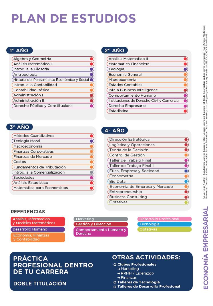 Economía Empresarial prepara profesionales capaces de asumir los desafíos propios de un manager o un administrador de empresas tales como diseño de estrategia de negocios, evaluar alternativas de inversión, dirigir y organizar equipos, etc. Pero, en este caso, sustenta sus decisiones con una visión cuantitativa mediante la utilización de herramientas estadísticas, econométricas y tecnológicas.