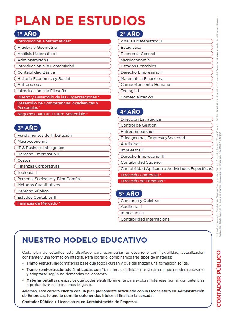 La carrera de Contador Público prepara profesionales para ejercer, de modo independiente, ante terceros: personas, empresas, instituciones públicas y privadas. Asimismo, para desempeñar cargos internos en empresas en las áreas financiera, administrativa-contable, auditoría, tributaria, costos y control. Esta carrera sirve de base para desarrollar tareas de sindicatura en materia concursal, peritajes y otras actuaciones al servicio de la justicia.