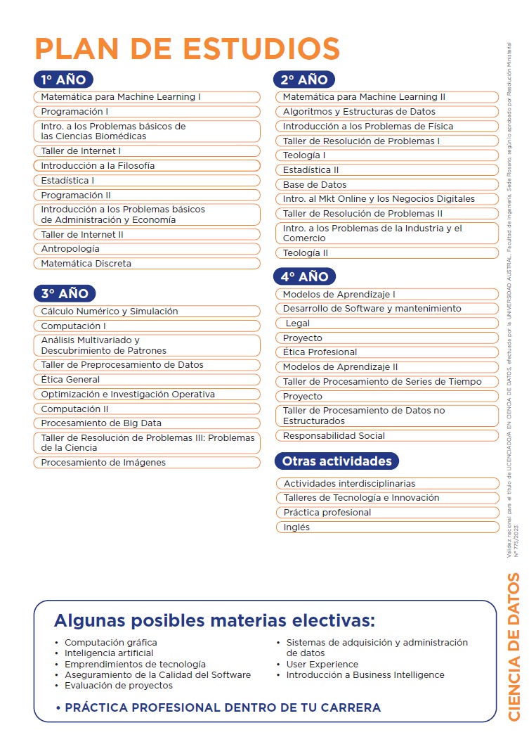 La carrera tiene como objetivo formar graduados con una sólida cultura científica en computación, estadística y matemática, capaces de afrontar desafíos tanto del sector productivo como del académico en distintas áreas que requieren del modelado y manejo de datos.
