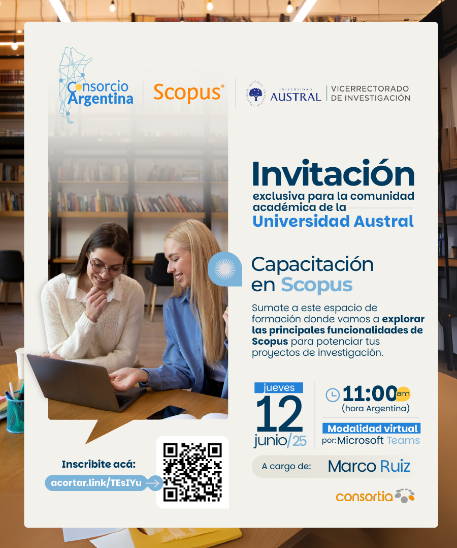 Capacitación sobre el uso de Scopus. Este fue el taller que se realizó el 12 de junio en el marco del Ciclo de Talleres de Investigación 2025, impulsado por el Vicerrectorado de Investigación de la Universidad Austral.