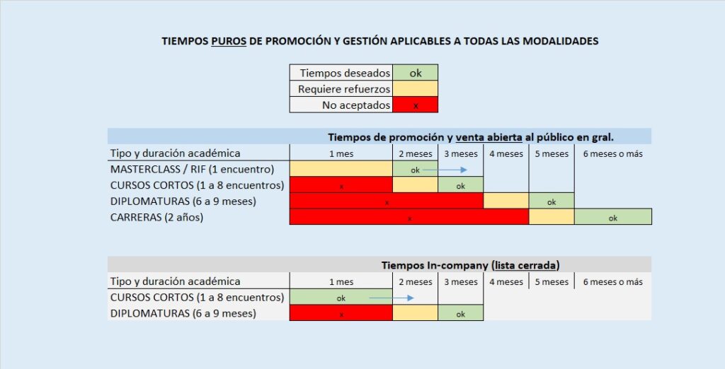 Actividades en 1era edición preferentemente, deberán ejecutarse en el 2do semestre del año en curso, respetando los tiempos de presentación correspondientes a la propuesta académica. A efectos promocionales, publicitarios y de sondeo de mercado, estas actividades, deberán ser acompañadas por masterclasses, webinars y charlas informativas en el semestre anterior a su realización.